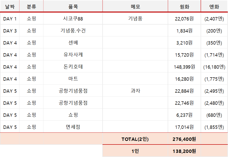 예산에는 포함되지않은 쇼핑 비용. 쇼핑은 1인기준 138,200원을 사용했습니다. 관광지와 시내의 기념품숍에서 산 기념품과 특상품, 돈키호테에서 산 술과 간식들, 면세점에서 산 지역특산 과자들이 대부분입니다.