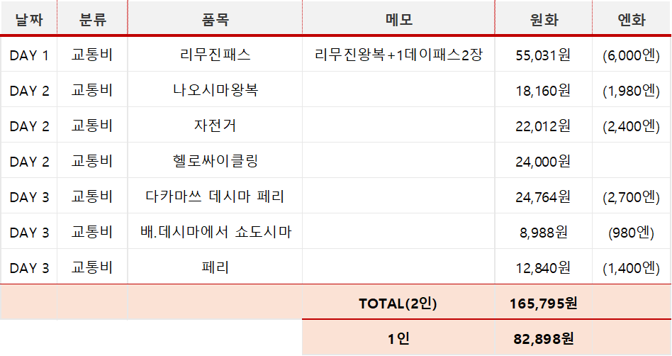 교통비는 총 82,897원(1인) 이 들었습니다.지하철은 리무진 왕복권과 세트로 구매한 고토덴패스 2장으로 알뜰하게 사용했습니다. 섬에 가는 날은 페리와 자전거 비용만 사용했고, 섬에 가지 않는 날만 고토덴 패스를 사용했습니다. 이처럼 섬에 가는날과, 다카마쓰안에서 지하철을 타는 날로 나누면 효율적으로 교통비 사용이 가능합니다.