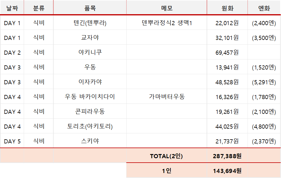식비는 5일 동안 1인당 143,694원 이 나왔습니다. 간식은 별도로 계산해서 포함하지 않았습니다. 체감상 한국에서보다 훨씬 저렴한 것 같습니다. 일반적인 식당을 들어가거나, 이자카야를 들어가더라도 한국에서보다 금액이 적게 나옵니다. 다카마쓰는 우동으로 유명한만큼 여러 우동집들을 다니게 되는데, 우동이 가성비 좋은 음식인만큼 식비도 줄어드는 부분이 있는 것 같습니다.