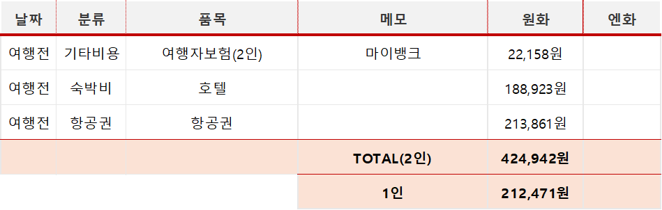 결론적으로 4박5일간 2인 1,182,848원이 들었고, 1인당 약 59만원이 들었습니다.