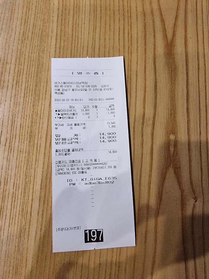 햄버거를 주문하고 받는 데까지 시간이 좀 걸렸습니다. 약 15분 이상 걸린 것 같네요. 수제버거 치고도 시간이 좀 더 많이 걸린 편인 것 같아요