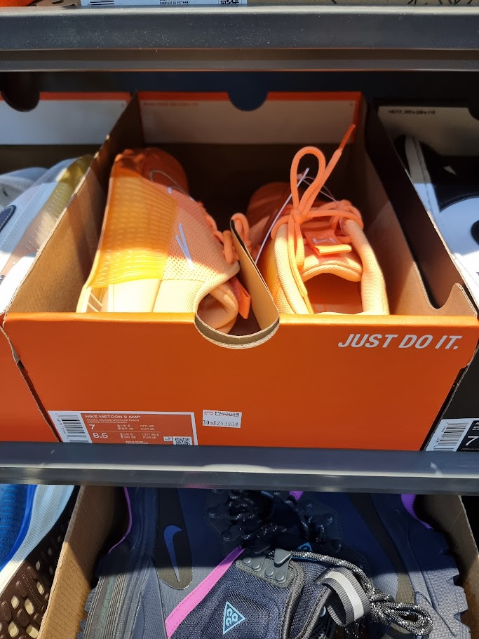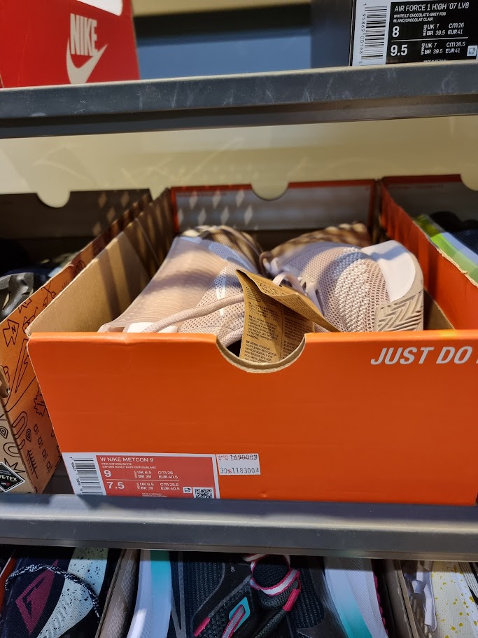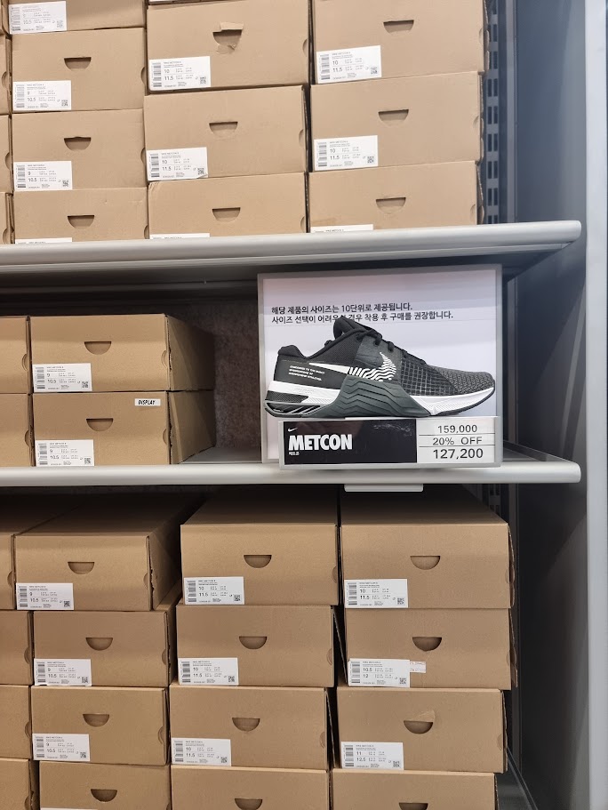 구매를 고민했던 메트콘입니다. 헬스나 웨이트, 크로스핏을 하는 사람들이 많이 찾는 신발입니다. METCON 9모델이 주로 있었는데, 시흥 아울렛에는 재고가 아주 소량만 남아있었습니다. 메트콘의 경우 김포가 매장도 크고, 재고도 많이 보유중이었습니다. 30퍼센트 할인해서 118,300원, 메트콘9AMP는 30퍼센트 할인해서 125,300원 이었습니다.