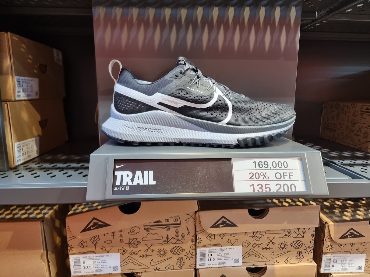 트레일런 신발(NIKE REACT PEGASUS TRAIL4)은 20퍼센트 할인해서 135,200원 이었습니다.