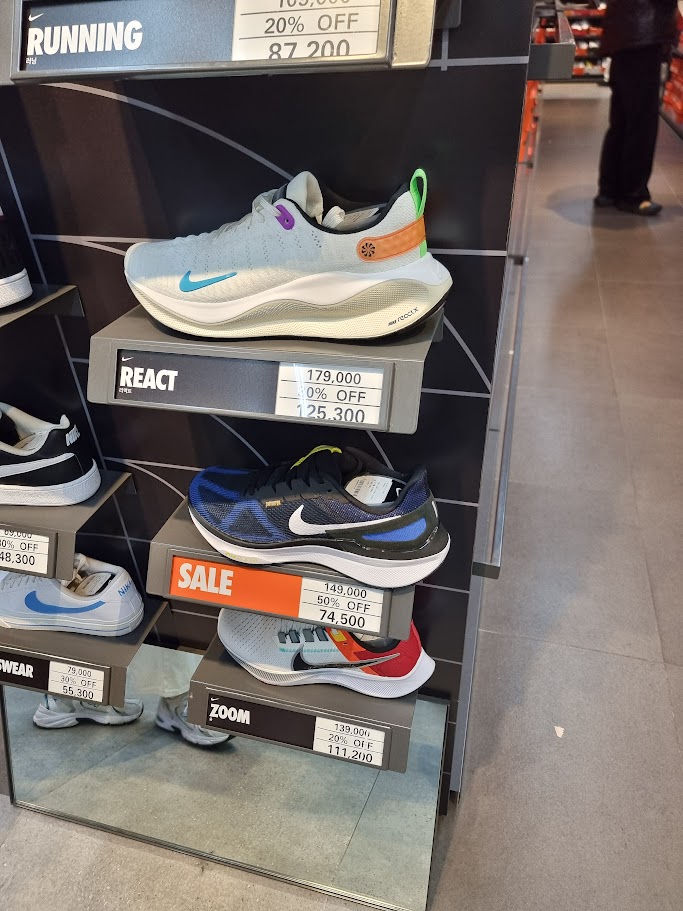 시흥 아울렛보다 김포 현대 아울렛의 나이키 매장이 크고, 품목도 좀 더 많은 것 같습니다. 가격은 같아보입니다.