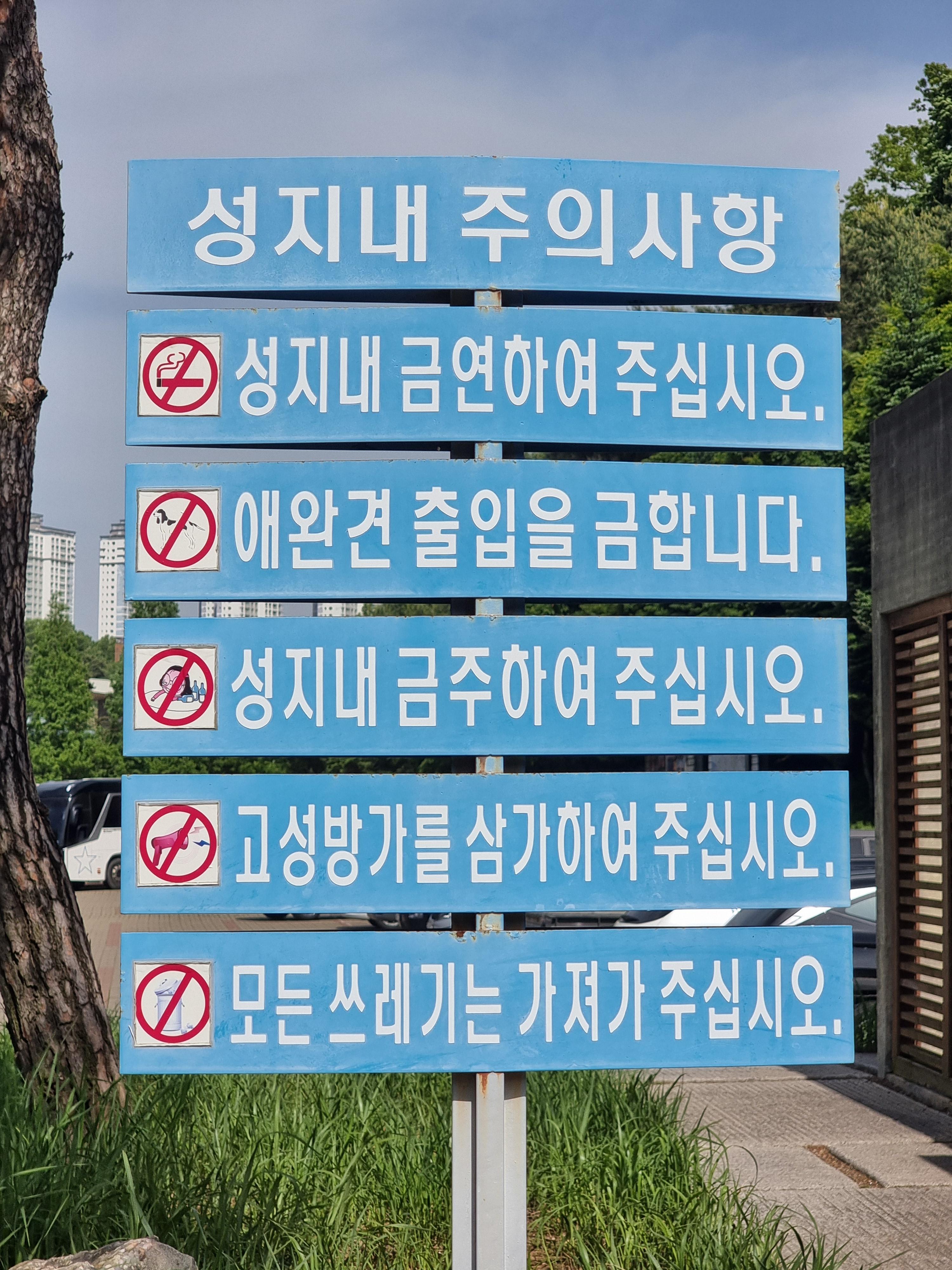 성지다 보니 몇 가지 주의사항들이 있습니다. 애완견 동반 출입이 안 되고, 금주 고성방가도 안됩니다. 그리고 운동복 차림도 지양해야 한다고 합니다.