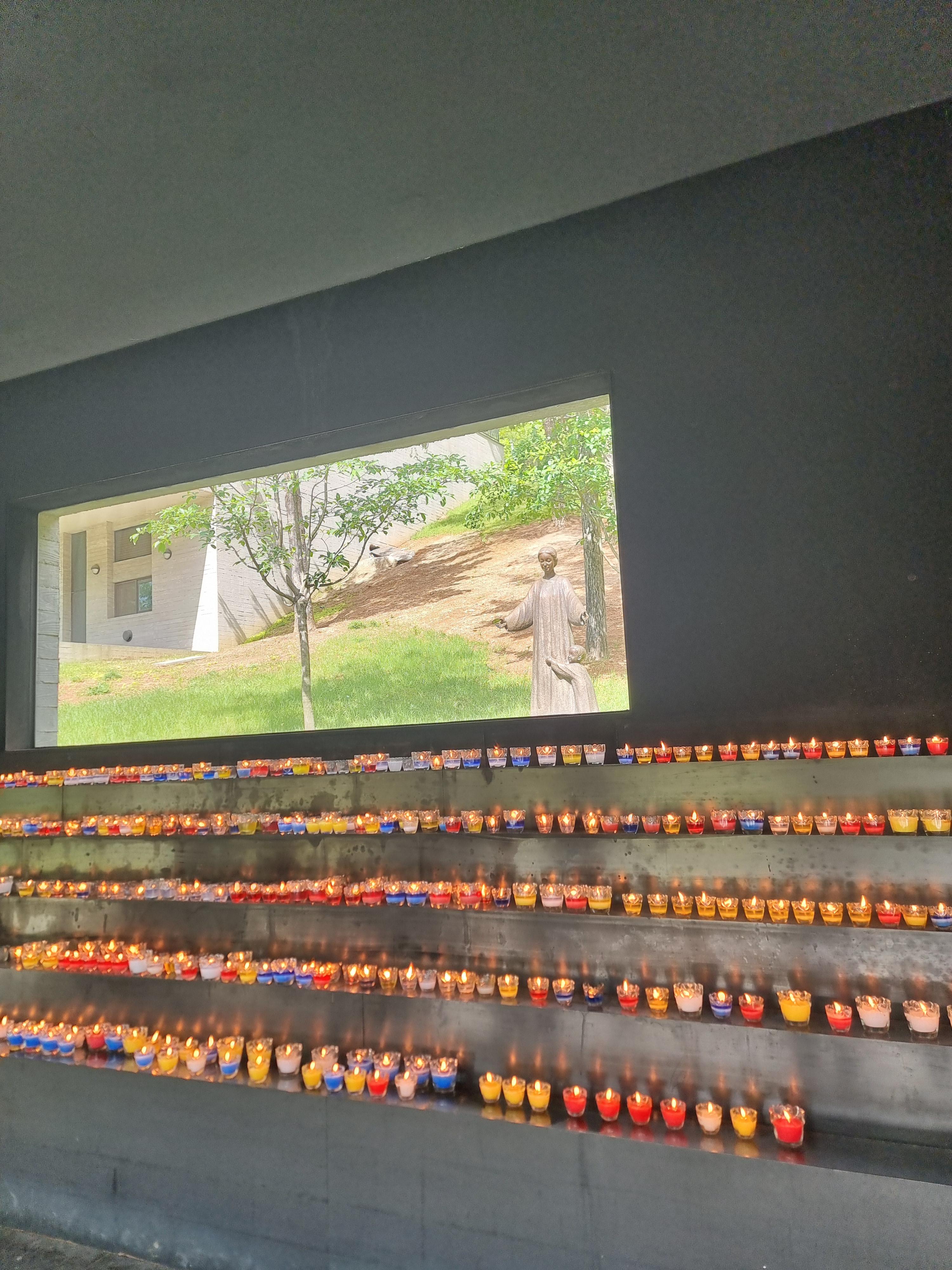 내부에는 봉헌된 초들 과, 창 밖으로 마리아 상이 보입니다. 종교는 없지만 성스러운 느낌이 드는 것 같습니다