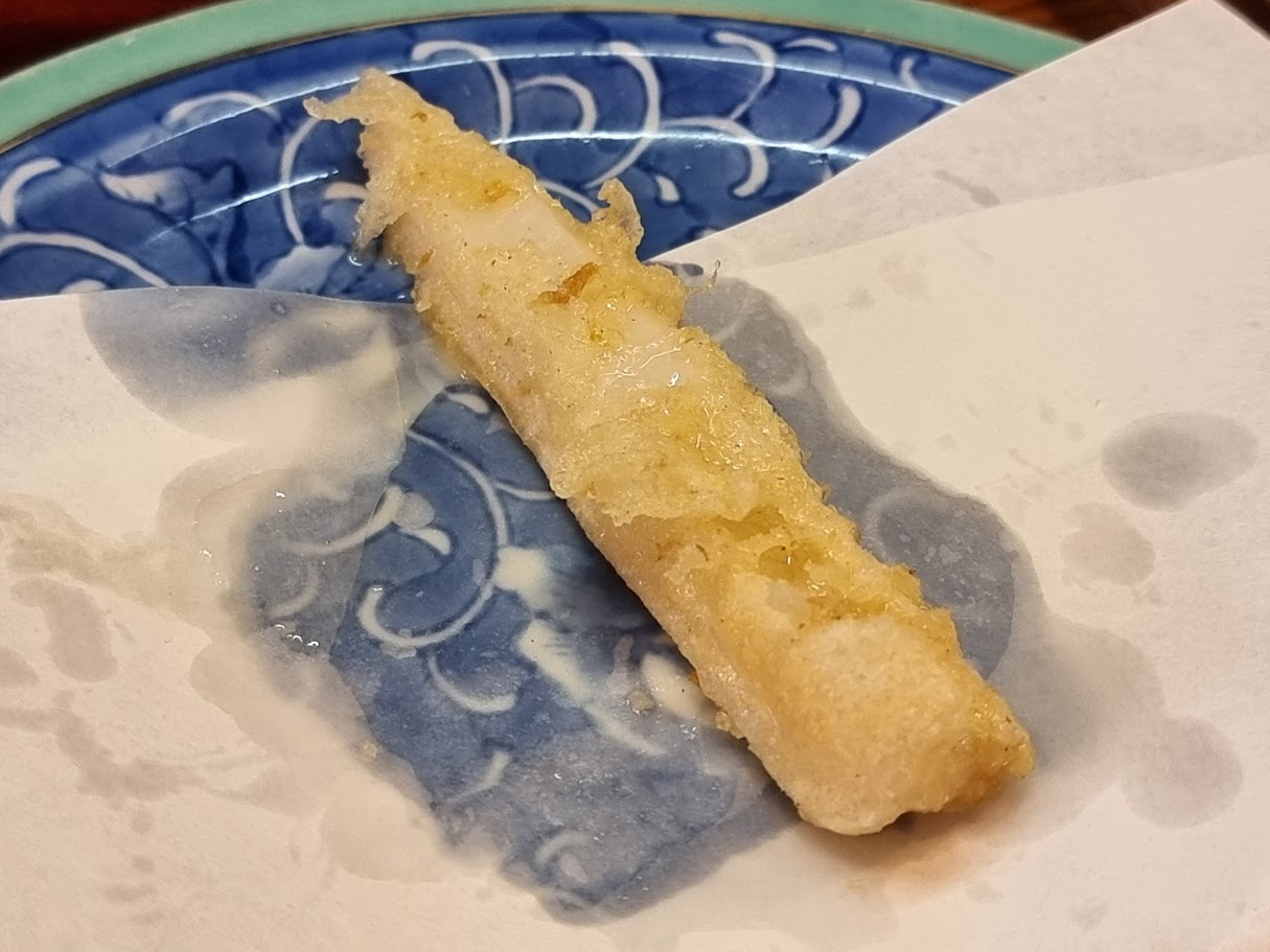 튀김 정식을 주문하면 밥과 반찬, 그리고 소금과 간장이 개인 접시에 제공되며, 오마카세처럼 튀김이 하나씩 갓 튀겨져 올라옵니다. 세우, 생선, 오징어, 연근 등 다양한 재료가 순차적으로 등장하는데, 따뜻하고 바삭한 튀김은 그 자체로 최상의 맛을 선사합니다. 한국에서 익숙한 분식집 스타일과는 다른 새로운 맛이 느껴지기도 합니다.