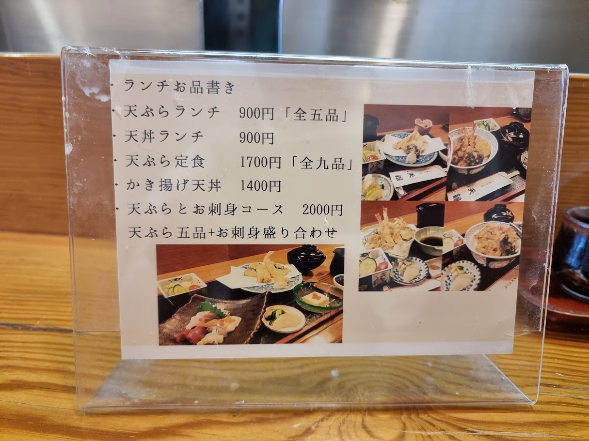'텐긴'은 점심 시간에 런치 세트를 제공합니다. 텐푸라 런치세트와 텐푸라동 런치세트가 각각 900엔에 제공되며, 저는 텐푸라 런치세트와 함께 맥주 한 잔을 주문했습니다.