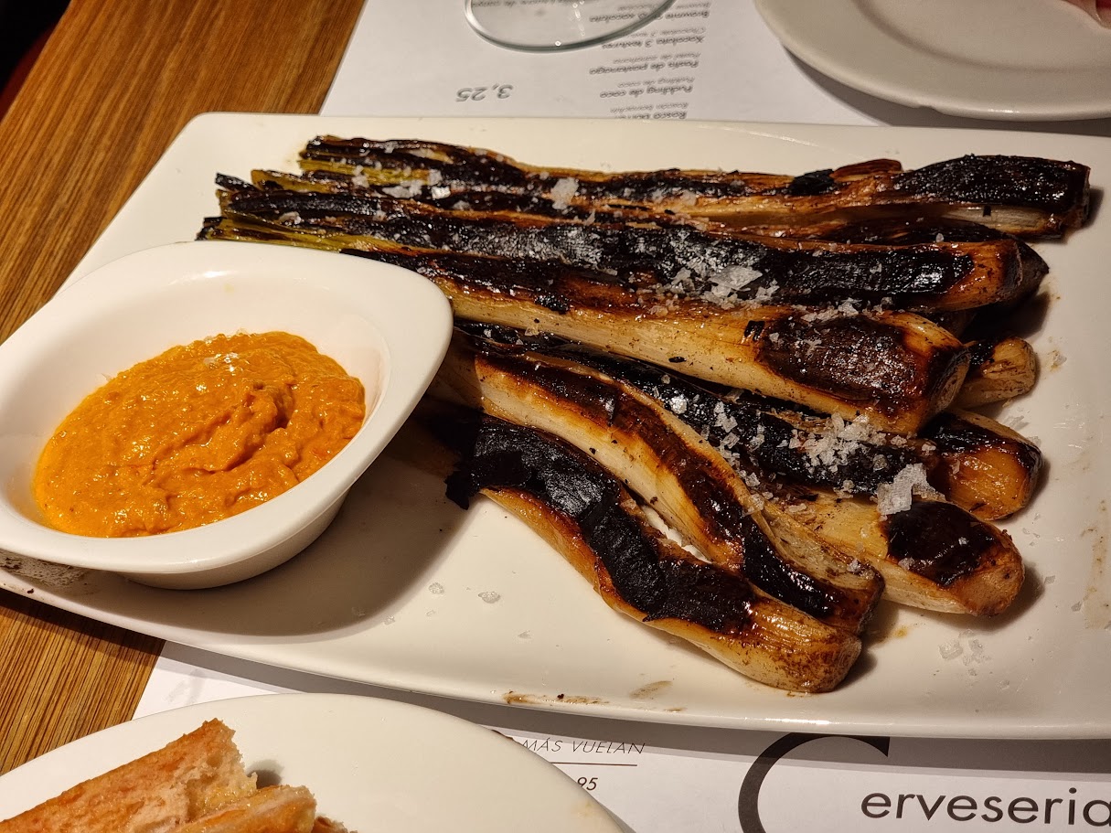 추가로 주문한 칼솟. 칼솟은 스페인 지역에서 유명한 음식이라고 합니다. 대파와 비슷한 음식을 구워 로메스코 소스에 찍어먹는 음식입니다. 겨울쯤에 먹을 수 있다고 하는데, 마침 방문할 때 칼솟을 먹을 수 있는 기간이라 주문해 보았습니다. 예전에 티비에서 오세득셰프가 스페인에서 먹는 걸 보고 꼭 먹어보고 싶었다고 생각했는데 드디어 먹어보게 되었네요.