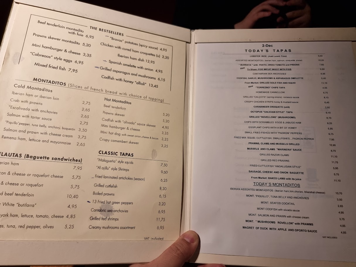 메뉴가 너무 다양하고, 낯설어서 주문하는데 시간이 좀 걸렸습니다. 여기를 방문하실 예정이라면 블로그나 구글리뷰등을 미리 확인해서 메뉴를 사진으로 보고 메뉴명들을 찾아가는 게 좋을 것 같습니다. 저는 하몽과 빤콘토마떼, 칼솟을 주문했고, 1/2 보틀의 까바도 함께 주문했습니다.