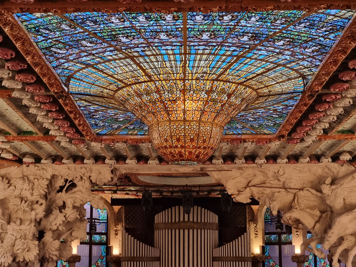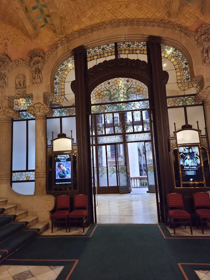 입장하자마자 눈앞에 펼쳐진 화려한 내부에 감탄했습니다. 바르셀로나의 대표적인 건축물 중 하나인 카탈루냐 음악당은 곳곳에 예술적 감각이 넘쳐났습니다. 다채로운 스테인드글라스, 정교한 조각, 화려한 모자이크 등 눈길을 사로잡는 요소들이 가득했습니다. 특히, 무대 뒤쪽에 설치된 거대한 파이프 오르간은 압도적인 존재감을 발산했습니다.