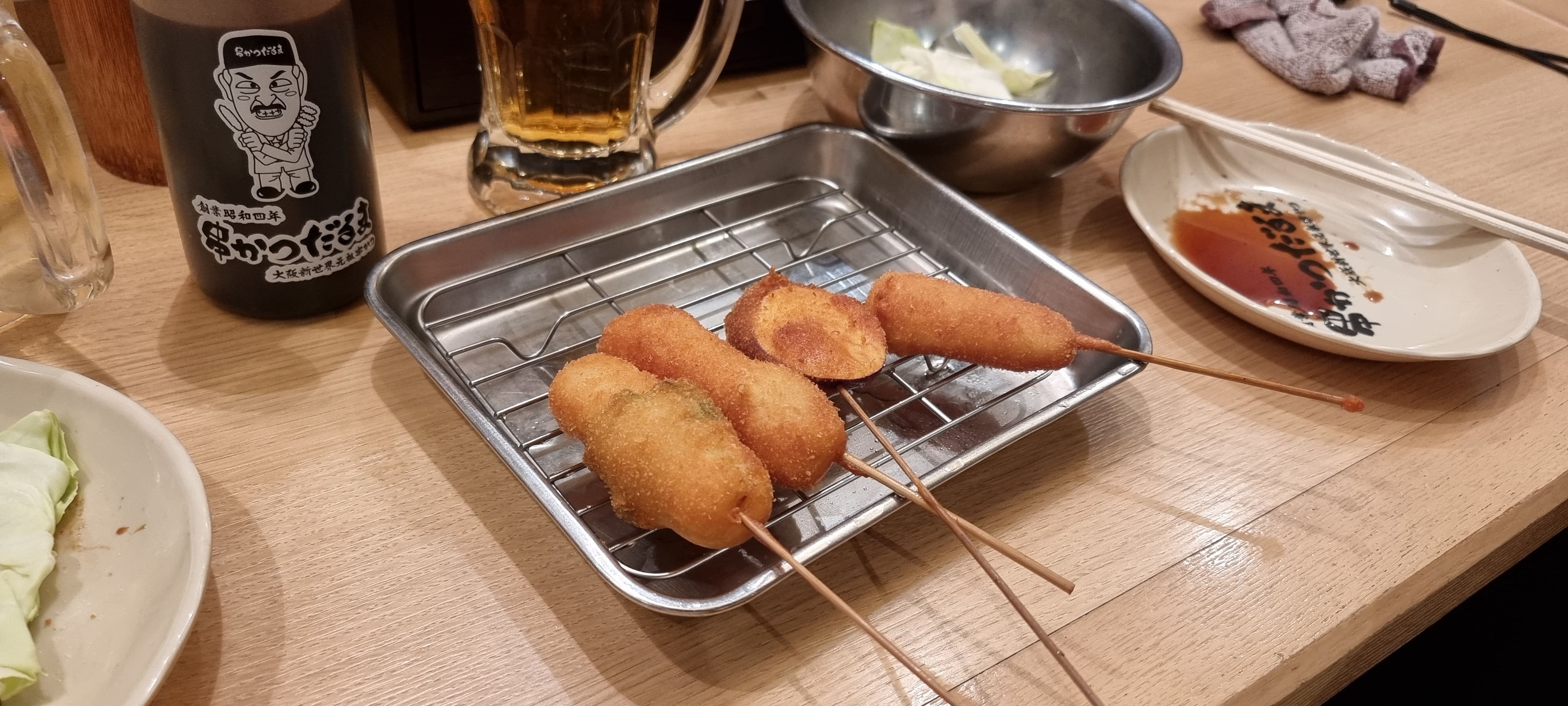 쿠시카츠는 꼬치에 여러 음식들을 꽂아서 튀겨먹는 음식으로, 오사카의 대표 먹거리 중 하나입니다. 닭꼬치나 돼지고기 같은 육류는 물론이고, 연근, 고추 같은 야채와 치즈, 명란 같은 다양한 식자재를 사용합니다. 일본 현지인들이 퇴근 후 맥주 한잔 할 때도 물론이고, 여행객들도 오사카에 와서 명물 맛을 보기 위해 찾는 음식입니다.