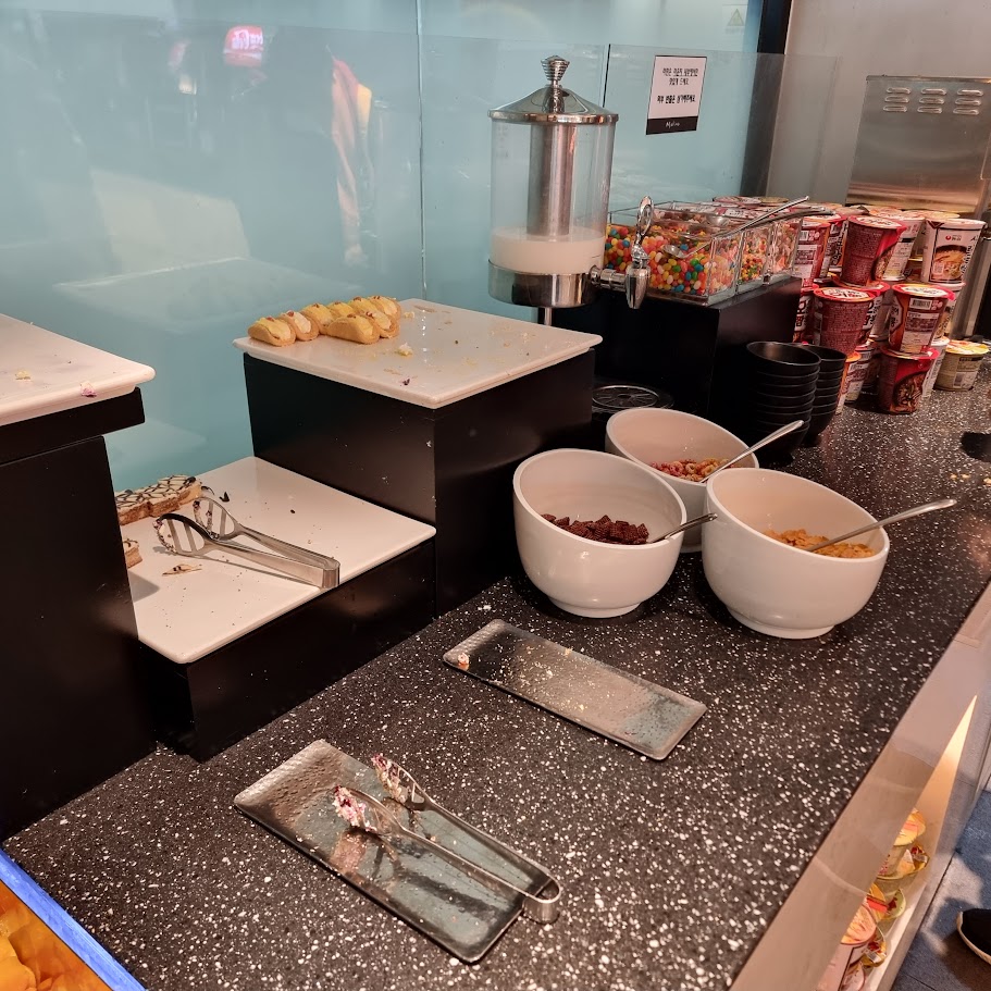 내부는 자유롭게 편하게 앉아서 음식을 가져다 먹을 수 있는 구조입니다. 인기가 많은 곳이라 사람도 조금 붐비는 분위기였습니다. 저는 아침시간에 대기 없이 이용 가능했는데, 시간 때에 따라서 사람이 더 많을 수도 있을 것 같네요. 라운지라고 해서 럭셔리하고 고급스러운 분위기는 아니고, 편하고 캐주얼하게 식사를 할 수 있는 곳이었어요.