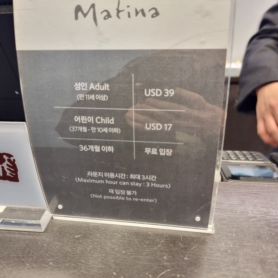 현금으로 입장 시 39달러로 아주 비싸네요. 현재 환율로 5만 원 정도. 마티나 라운지 이용이 아주 만족스러웠지만, 5만 원을 내고 이용할 정도는 아니에요. 신용카드혜택을 사용하거나, 다른 할인 또는 쿠폰 등을 사용해서 입장하길 권해드립니다.