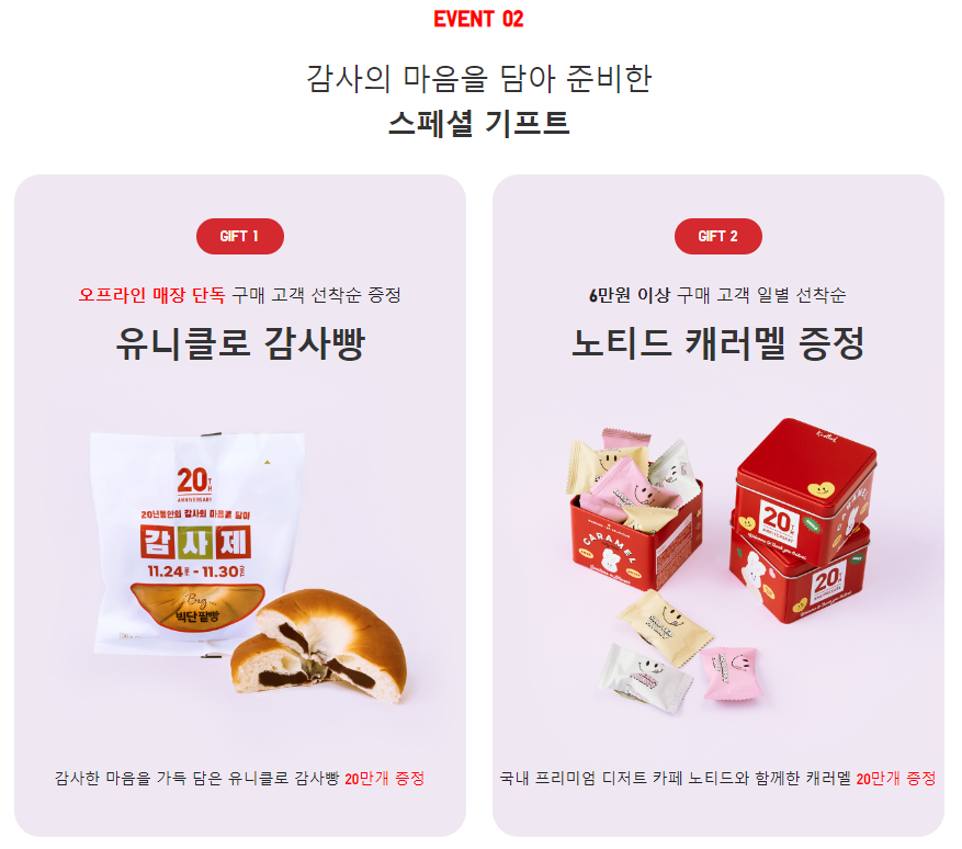 구매 고객에게 선착순 또는 추첨을 통해 상품을 줍니다. 올해 감사제때 상품을 사려고 기다리고 있었던 만큼, 일찍 방문해서 선물들도 받아와야겠어요.
