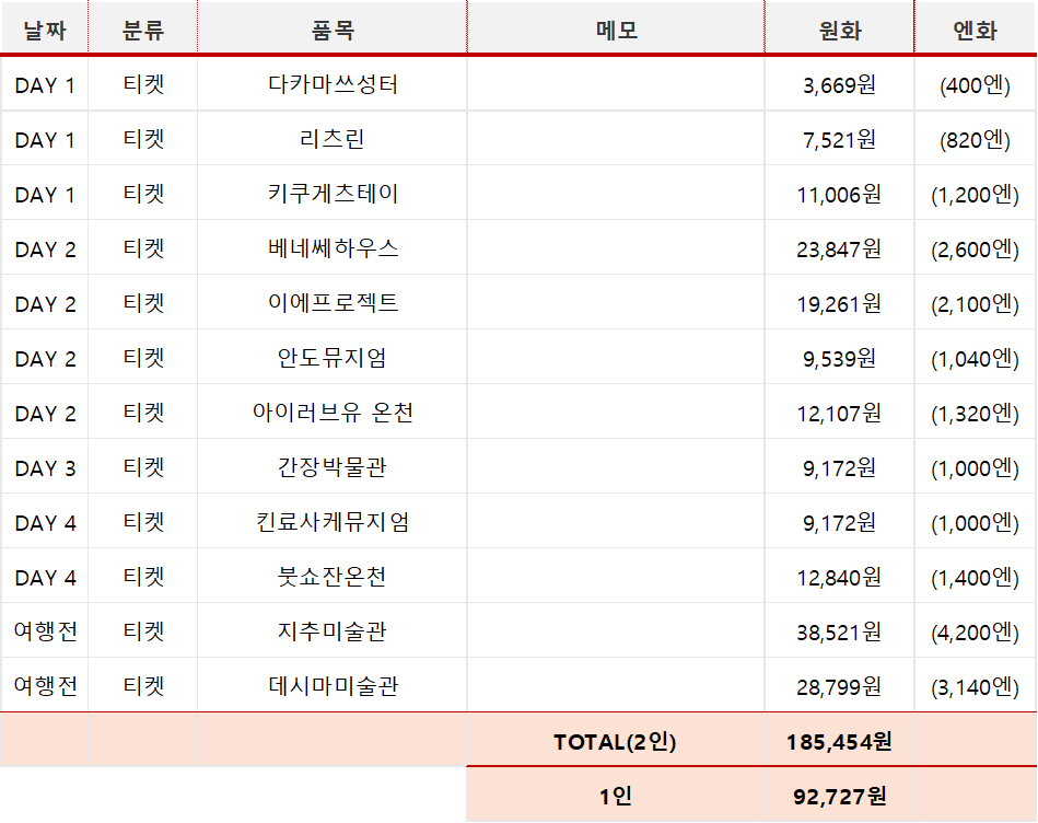 필수적으로 미리 예매한 항공, 호텔, 여행자보험을 제외하고, 현지에서 사용되는 비용들만 계산하면 1인당 517,153원이 들었습니다. 대략적으로 1일 체류비용은 1인당 10만원으로 잡을 수 있을 것 같습니다. 다카마쓰 여행 예산을 계획할때는 대략 하루에 1인당 10만원으로 계산하고, 추가적인 쇼핑이나 기념품, 비싼 식당들을 +알파로 고려하면 될 것 같습니다.