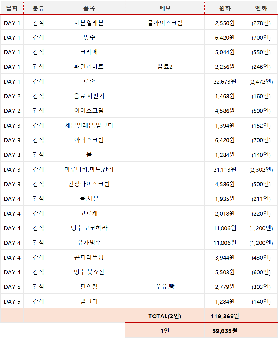 간식은 1인당 59,635원이 들었습니다. 해외여행을 가게되면, 그곳의 새로운 간식들을 찾아 먹는 것을 중요한 재미로 생각하고, 다양하게 찾아 먹는 편입니다. 일본 여행에서도 길거리 음식이나, 카페, 편의점들을 들르며 다양한 간식을 먹었는데, 돌아와서 계산해보니 하루에 만원꼴로 사용한 셈이네요.